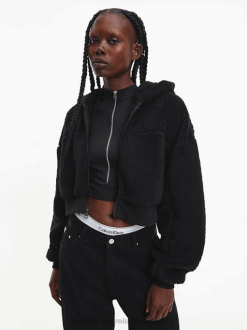 F64Z2367 Black Women Calvin Klein Cropped Sherpa Zip Up Hoodie