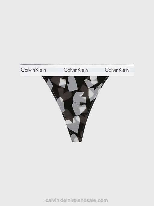 F64Z1156 Remembered Hearts Print Black Women Calvin Klein String Thong