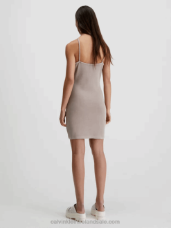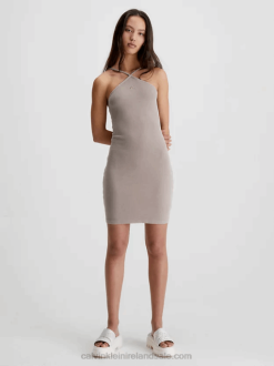 F64Z654 Shitake Women Calvin Klein Waffle Cotton Halter Neck Dress